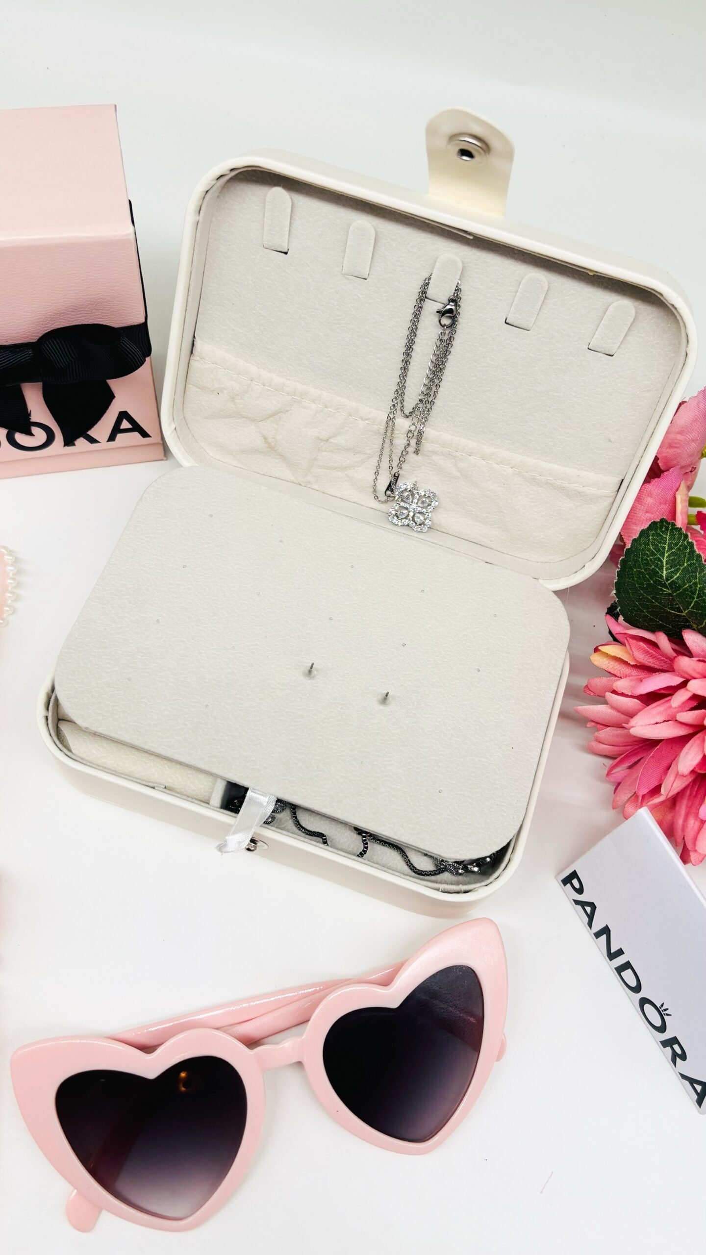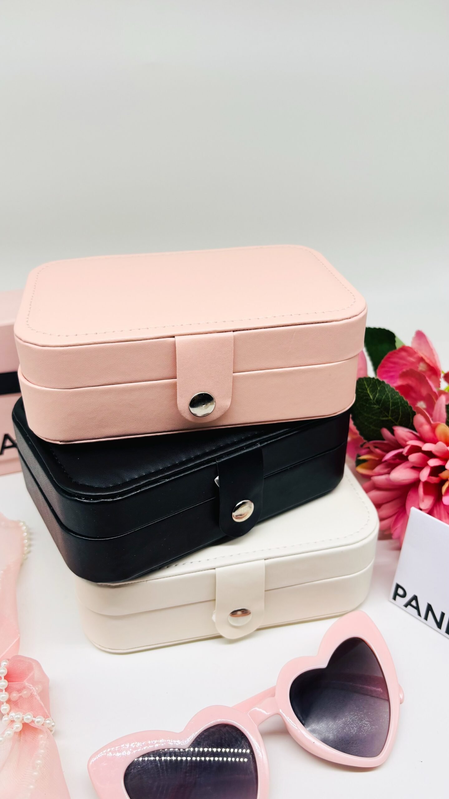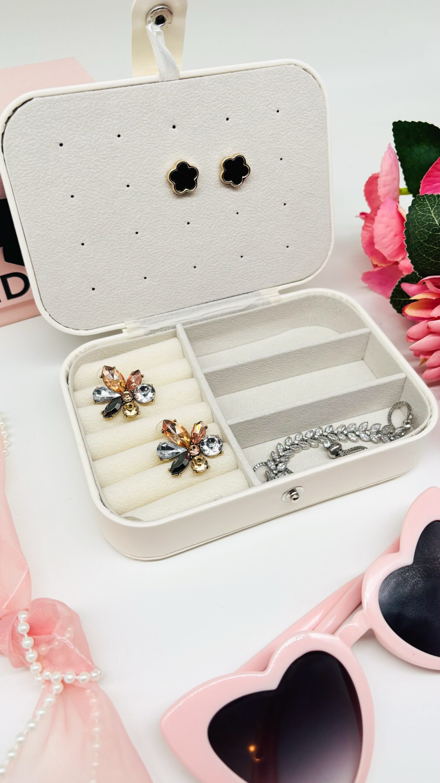 Stylish and spacious, this jewelry box features a dedicated stud earring card, multiple compartments for rings, necklaces, and bracelets, and a soft suede-lined interior. Perfect for keeping your jewelry secure and organized at home or on the go.
